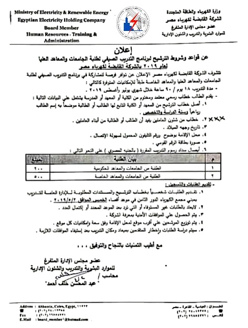 وزارة الكهرباء اعلان الشركة القابضة لكهرباء مصر لطلاب الجامعات والمعاهد المصرية حتى 2 5 2019