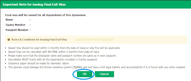 Jawazat people cleared the confusions of expatriates people who are processing or want to process the final exit visa s for their family members or relatives have to pay dependent fee from 1st july 2017 till the expiry date of their final exit visa. After the selection enter the following details. B payment of fees for each dependent in accordance with the validity period of the resident id. If any of your dependents wife children are living in saudi arabia you need to pay the dependent s fee for 2 months beyond the date you are applying for the final exit visa as the validity of the final exit visa is 60 days.